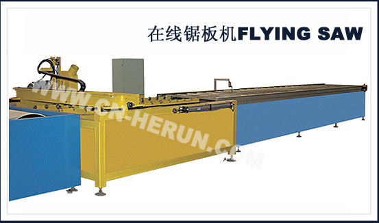 3、在副输送机的过渡段与下料段之间设有在线锯断机,根据板材不同长度的要求,对固化成型后输送线上的板材进行在线锯断。